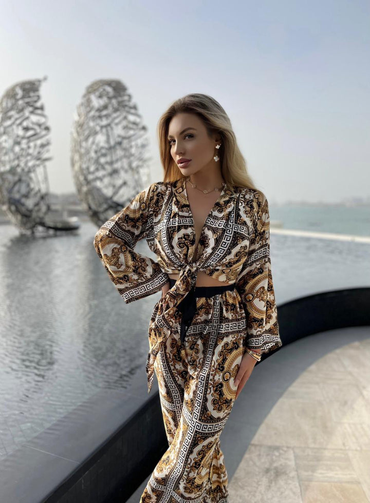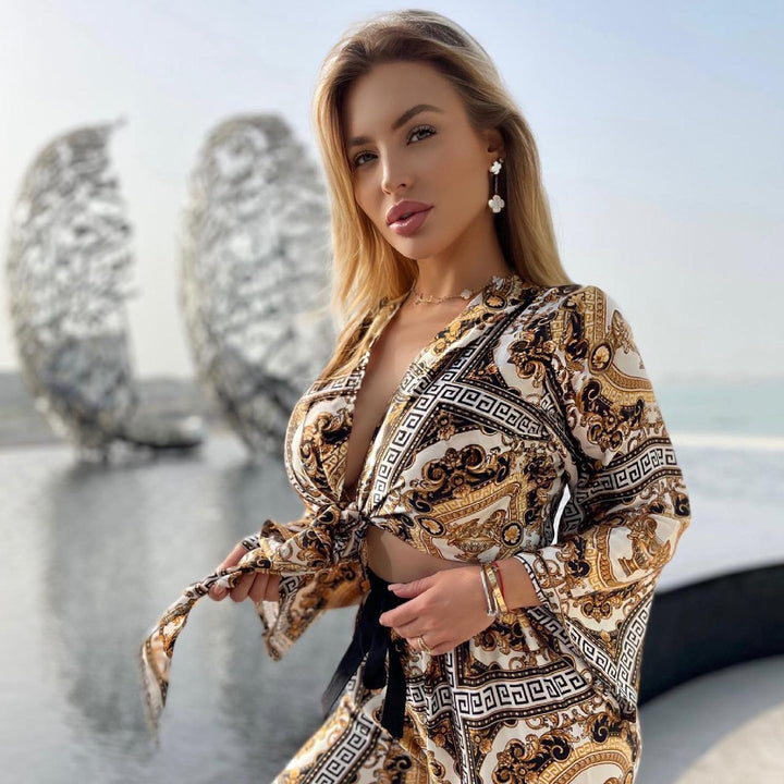 Les manches en V de la nouvelle chemise en soie s'ouvrent de l'avant avec des sangles sur la poitrine, des pantalons amples et confortables et une taille élastique.